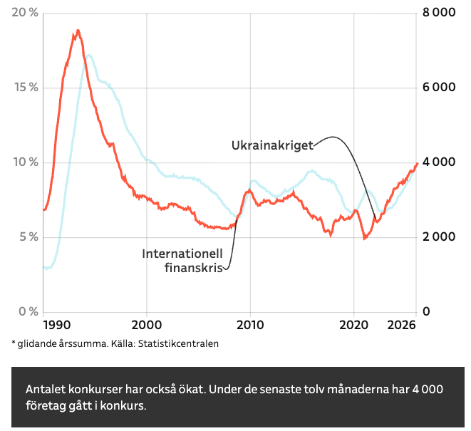 Antalet konkurser har också ökat. Under de senaste tolv månaderna har 4 000 företag gått i konkurs.