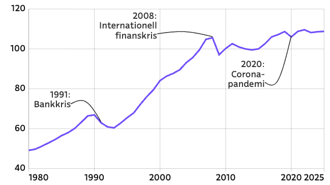 Bruttonationalprodukt till marknadspris, volymindex 2015 = 1004060801001201980199020002010202020251991:Bankkris2008:Internationellfinanskris2020:Corona-pandemi